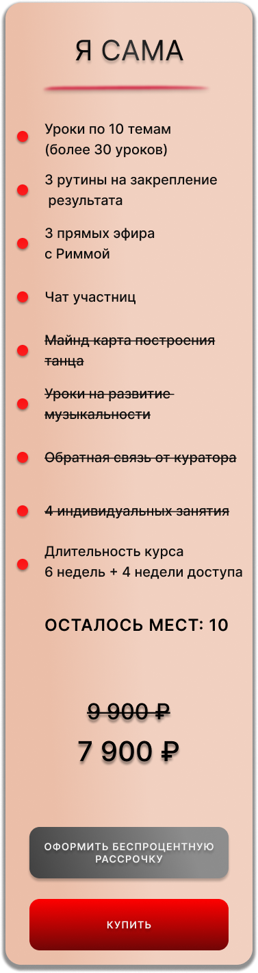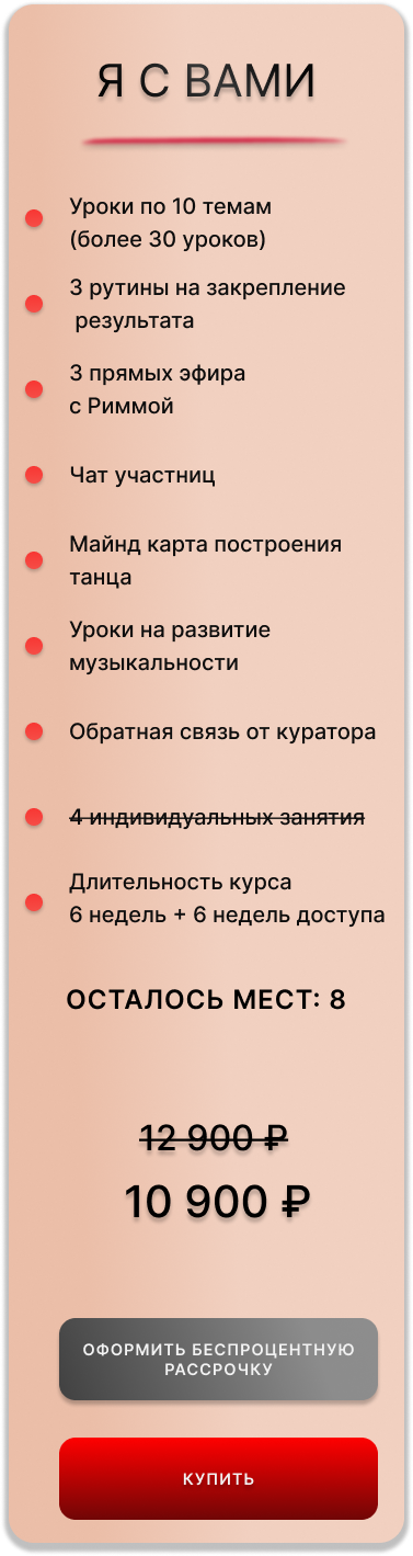 Я танцую уже 24 года, я посетила сотни мастер-классов. Знакома с классической базой танцев. За годы тренировок я собрала в одну систему, которая даст мощный толчок для твоего развития